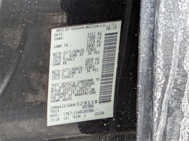 4WD, 110V/12V Outlets In Back Of Center Console, 2 Illuminated USB-A Ports In Back Of Center Console, 4-Pin/7-Pin Wiring Harness Connector (Rear Bumper), Auto-Dimming Rear-View Mirror, Automatic On/Off Headlights, Black Exterior Badging, Black Mirrors & Door Handles, Black Step Rails, Blind Spot Warning w/Rear Cross Traffic Alert, Body Color Front & Rear Bumpers, Body Color Front Grille w/Dark Insert, Charcoal Interior Trim, Chrome Interior Door Locks, Convex Spotter Mirror, Dark Headlamps, Dual Zone Automatic HVAC, Fog Lamps w/Black Fog Lamp Finishers, Front & Rear Parking Sensors, Heated Front Captain's Chairs, Intelligent Key System, Leather-Wrapped Steering Wheel, Midnight Edition, Midnight Edition Floor Mats, Nissan Navigation System, Painted Rear Bumper, Power Sliding Rear Window w/Defogger, Rain Sensing Wipers, Rear Air Conditioning Vents, Receiver Hitch, SV Convenience Package, Universal Garage Door Opener, Wheels: 20 Accessory. 2019 Nissan Titan SV 4WD 7-Speed Automatic 5.6L V8 Magnetic Black Metallic